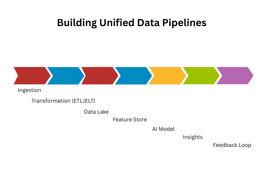 A global airline aggregates data from ticket sales, flight telemetry, maintenance logs, and customer feedback into a unified lake. Once standardized, this data is streamed into ML systems predicting flight delays or optimizing crew assignments — all in real time.